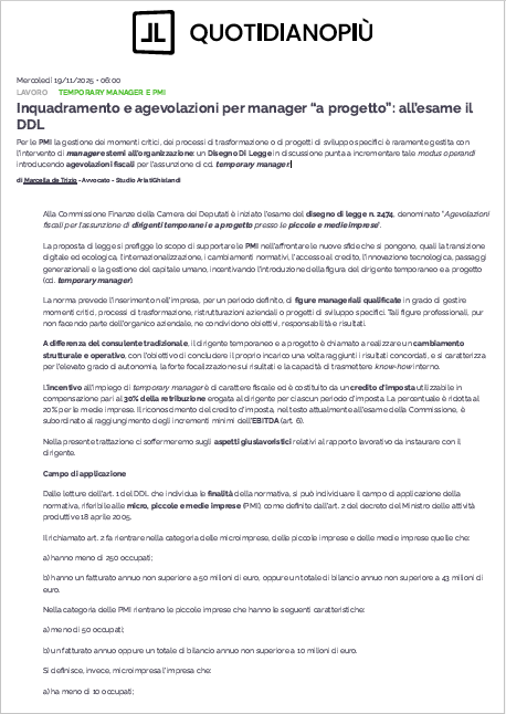 AG ha trattato il tema “Inquadramento e agevolazioni per manager “a progetto”: all’esame il DDL” pubblicato su QuotidianoPiù, edito da Giuffrè Francis Lefebvre a firma dell’avvocato Marcella de Trizio