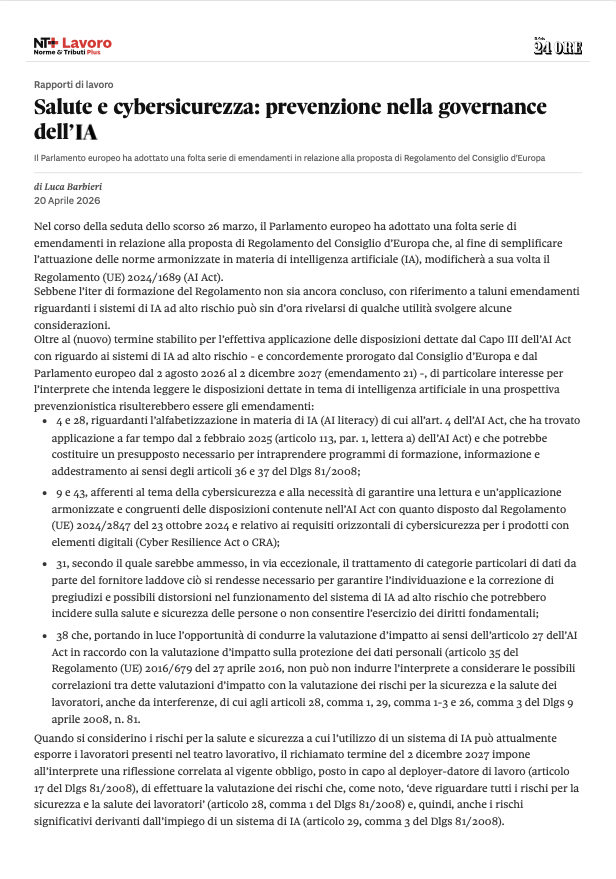 AG ha trattato il tema “Salute e cybersicurezza: prevenzione nella governance dell’IA” nell’articolo pubblicato su NT+Lavoro, edito da Sole24Ore a firma di Luca Barbieri.